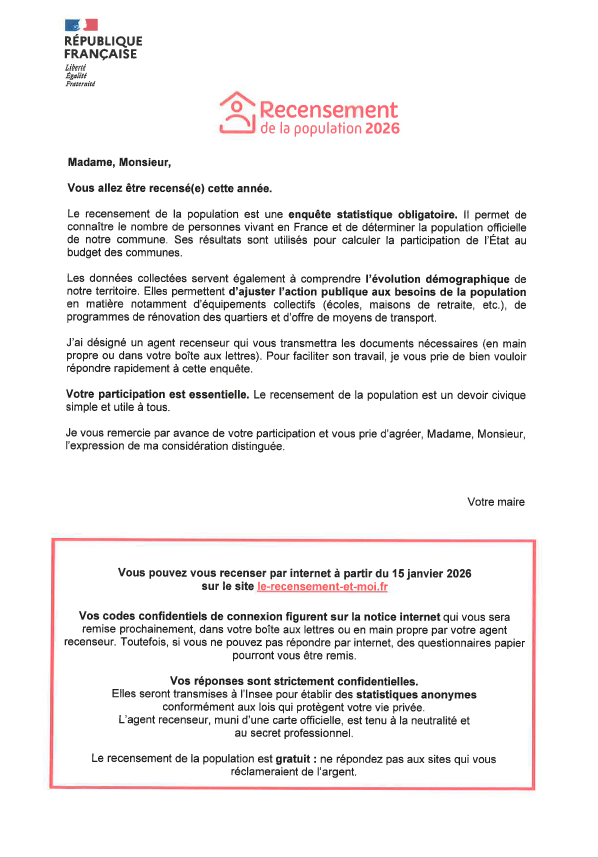 Je vous prie de trouver ci-joint un courrier explicatif ainsi qu’une photo des agents recenseurs qui seront vos interlocuteurs pendant toute la durée du recensement.